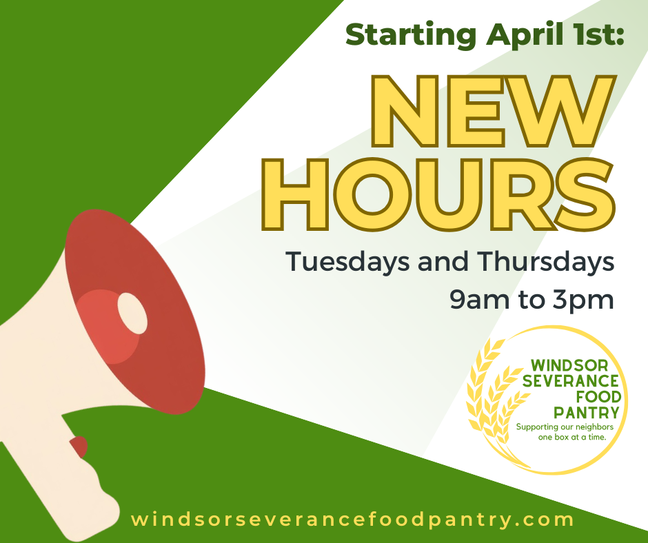 All residents of the Weld RE-4 School District can stop by every 4 weeks for a box of food stables and daily essentials (including meat). Tuesdays and Thursdays from 9:00am to Noon at 1051 Walnut St. in Windsor.